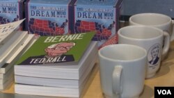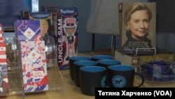 У крамниці на вибір покупців – книжки, чашки, футболки й значки, присвячені і тим кандидатам, що нині лишаються в перегонах й тим, що з них вже вибули. Тут можна знайти навіть розмальовки, присвячені Дональду Трампу. На них Трамп біля майбутньої антиіммігрантської стіни, він же в одязі Елвіса Преслі й навіть на підборах у сукні Мерлін Монро.