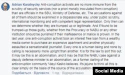Каратницький привернув увагу до скандалів, в яких фігурували активісти: «За останній рік, один з антикорупціонерів взяв безвідсоткову позику від багатого власника ЗМІ, інший фізично напав на сенсаційного журналіста».